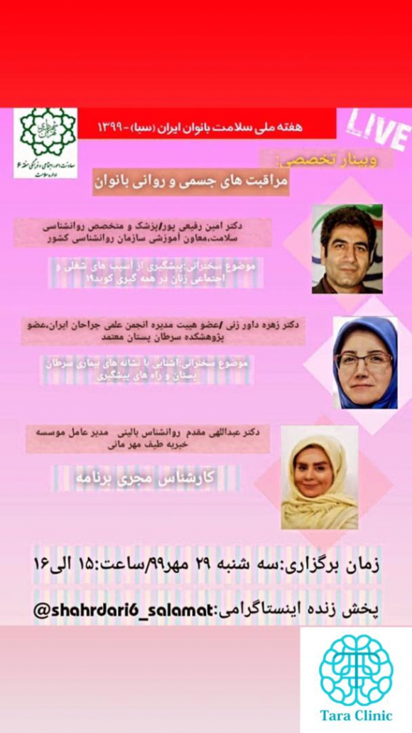 به مناسبت هفته ملی سلامت بانوان (سبا) – 1399 با حمایت  معاونت امور اجتماعی و فرهنگی شهرداری منطقه 6 تهران برگزار می گردد: زمان سه شنبه 29 مهر 99 ساعت 15 الی 16